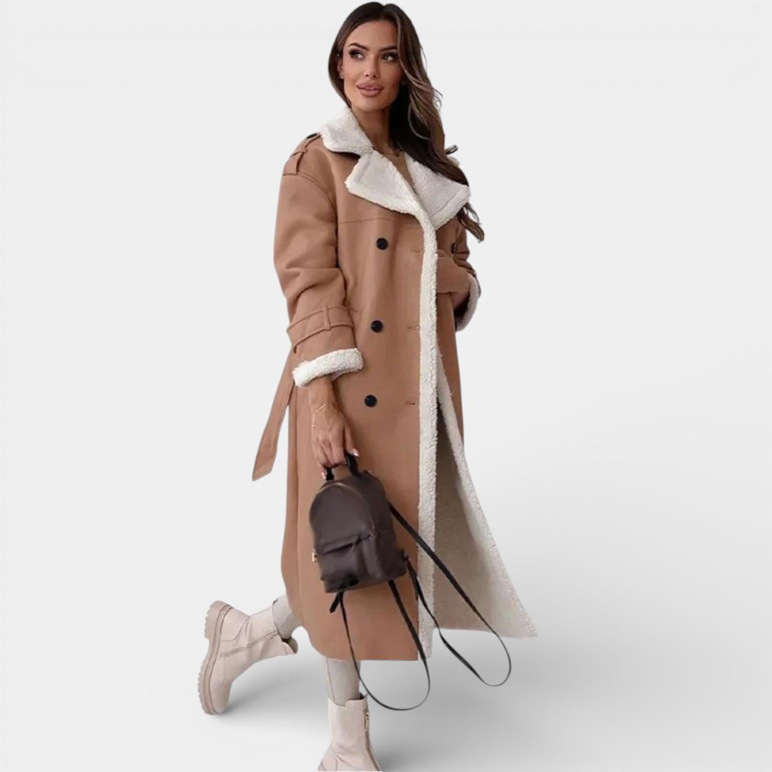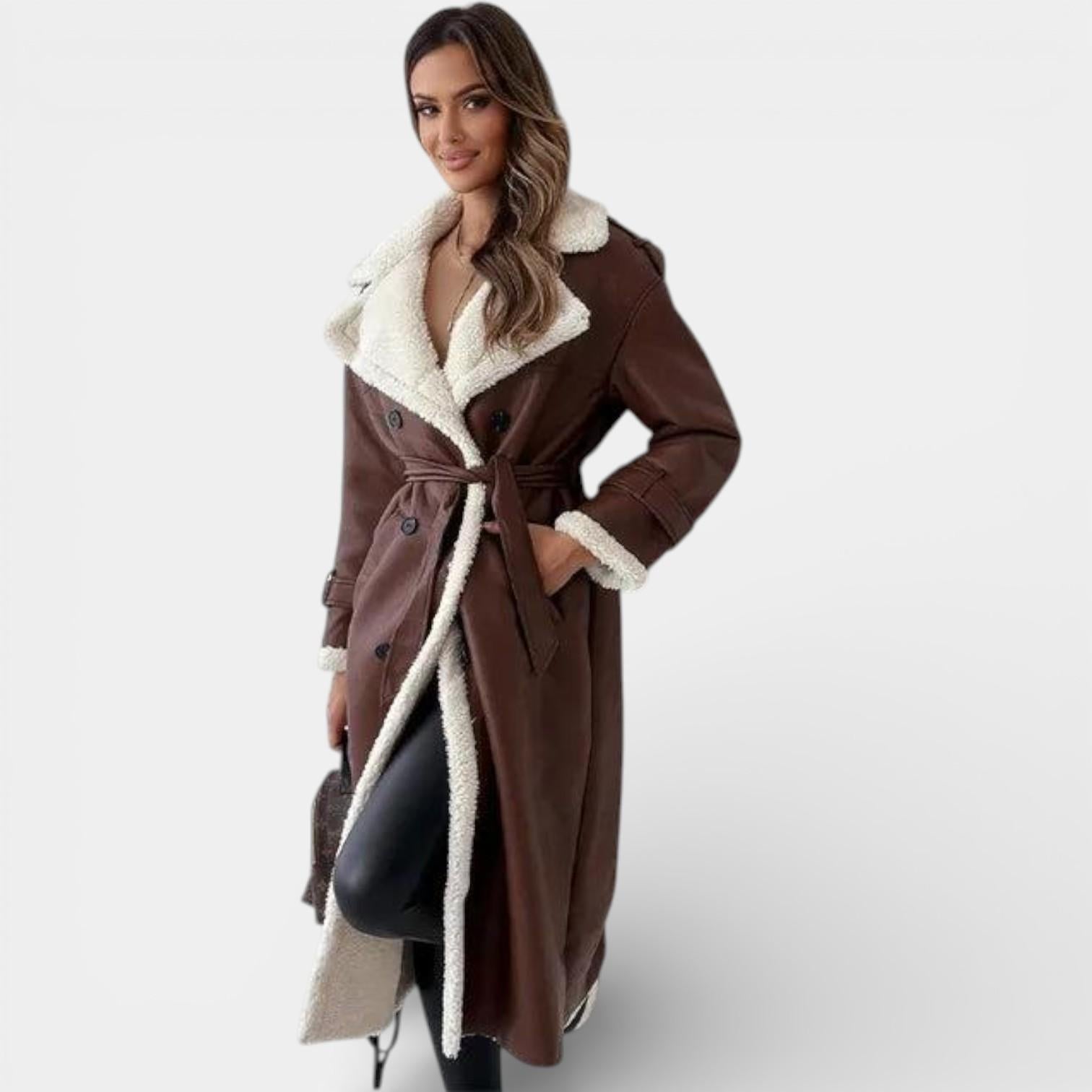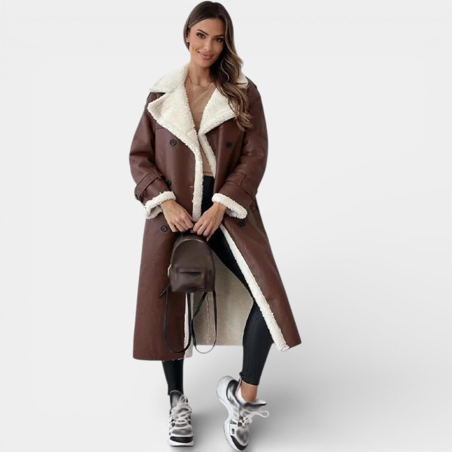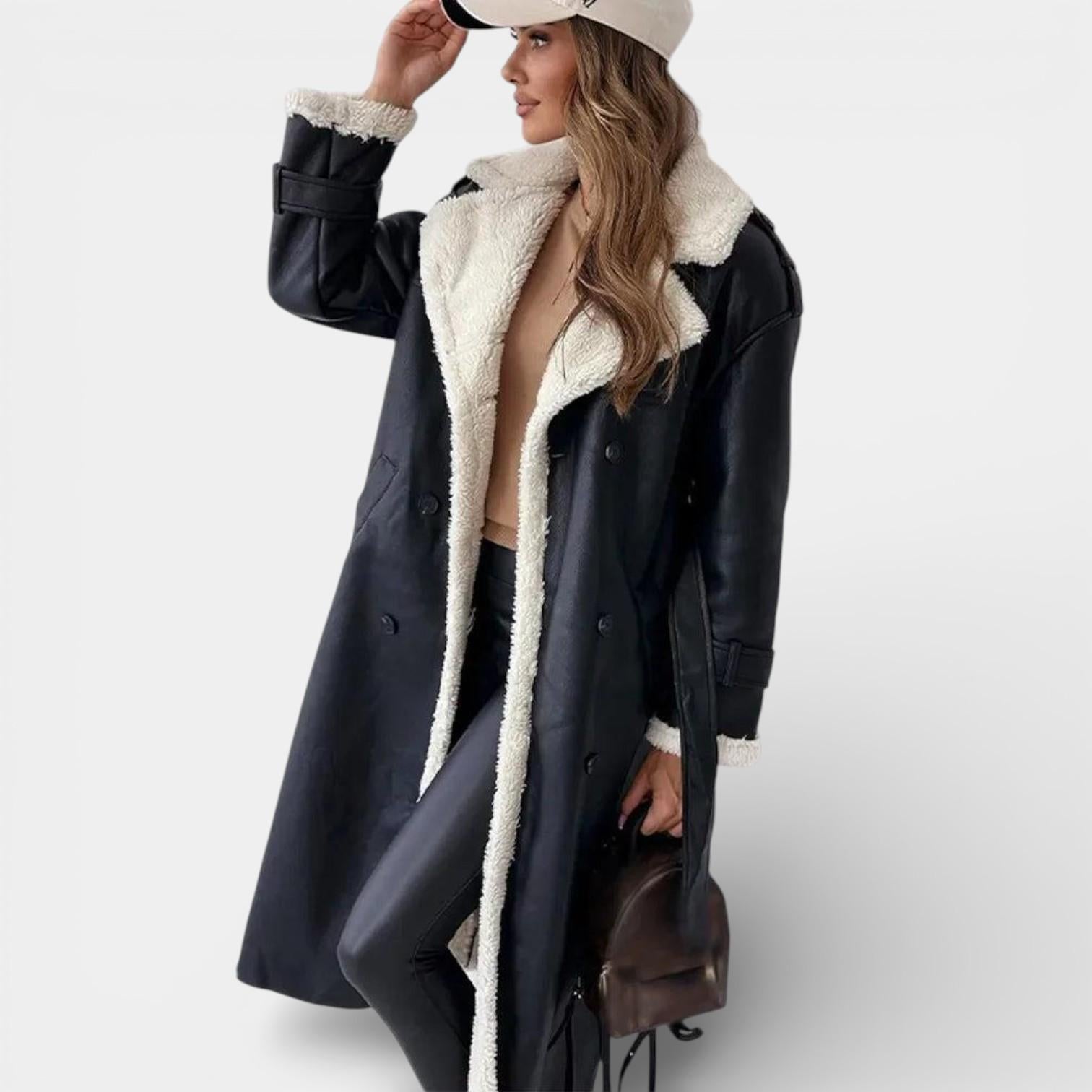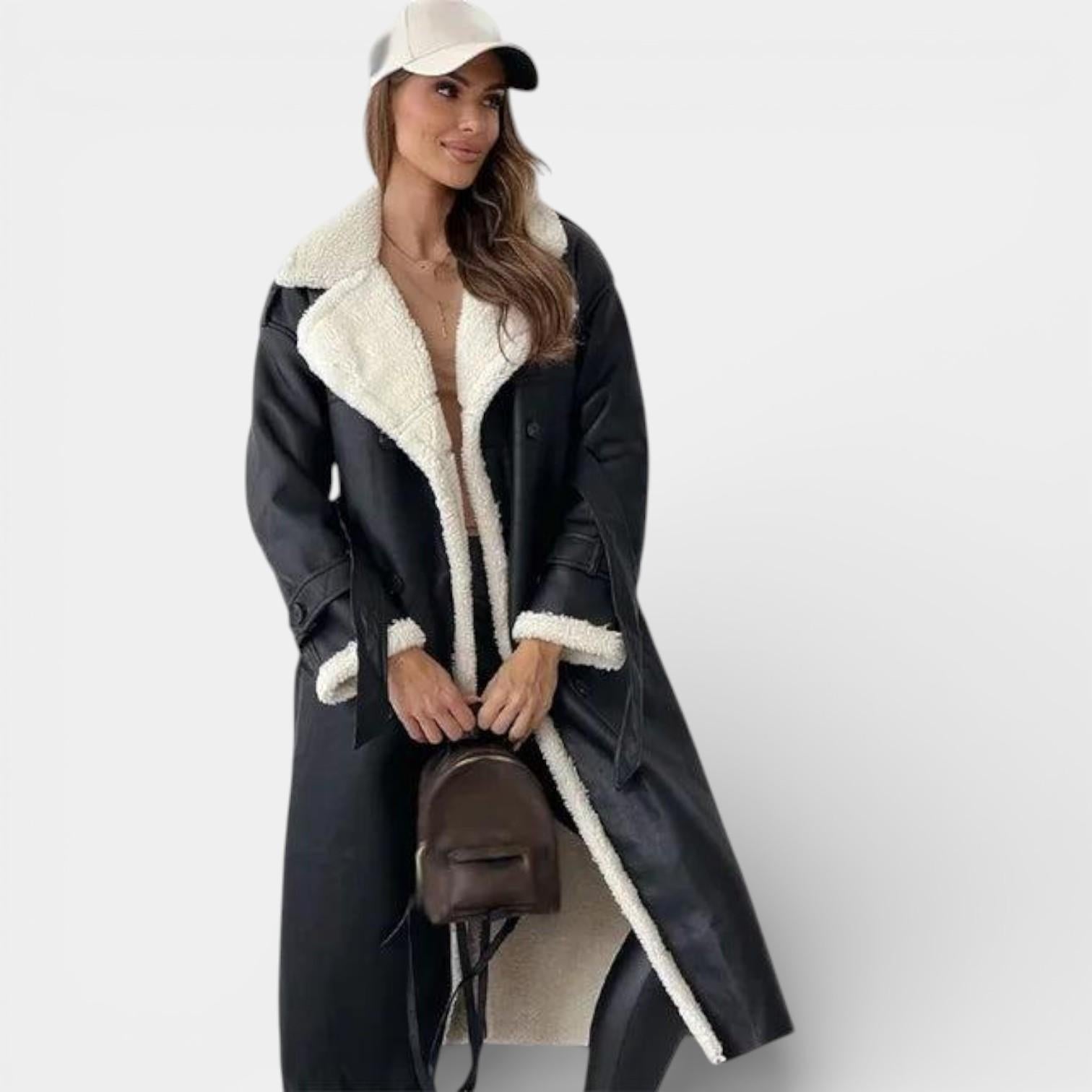 Introducing the Aurelia Faux Leather Trench Coat: Elevate your winter wardrobe with this exquisite blend of sophistication and warmth. Crafted with meticulous attention to detail, this coat is more than just a functional piece; it’s an embodiment of elegance designed for the modern woman.