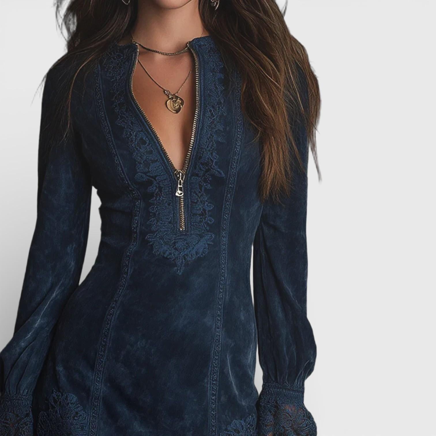 Crafted from buttery blue suede, this dress offers a texture so smooth you’ll find excuses to touch it. The fabric moves with you, flattering every step while keeping you wrapped in comfort. It’s not just a dress; it’s how sophistication feels.